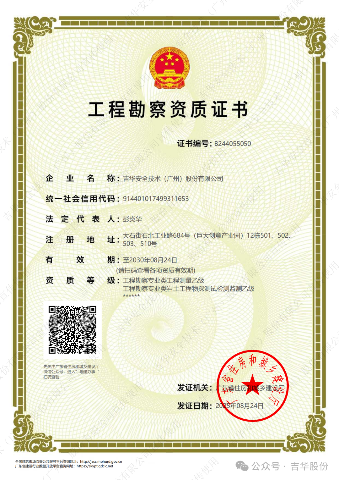 9月1日,经广州市住房和城乡建设局审核、广东省住房和城乡建设厅复核批准,吉华安全技术(广州)股份有限公司成功延续工程勘察专业类岩土工程(物探测试检测监测)乙级、工程测量乙级两项资质,并喜获新的资质证书。此次资质的成功延续,确保了公司各项业务的合法开展及生产经营的平稳运行。