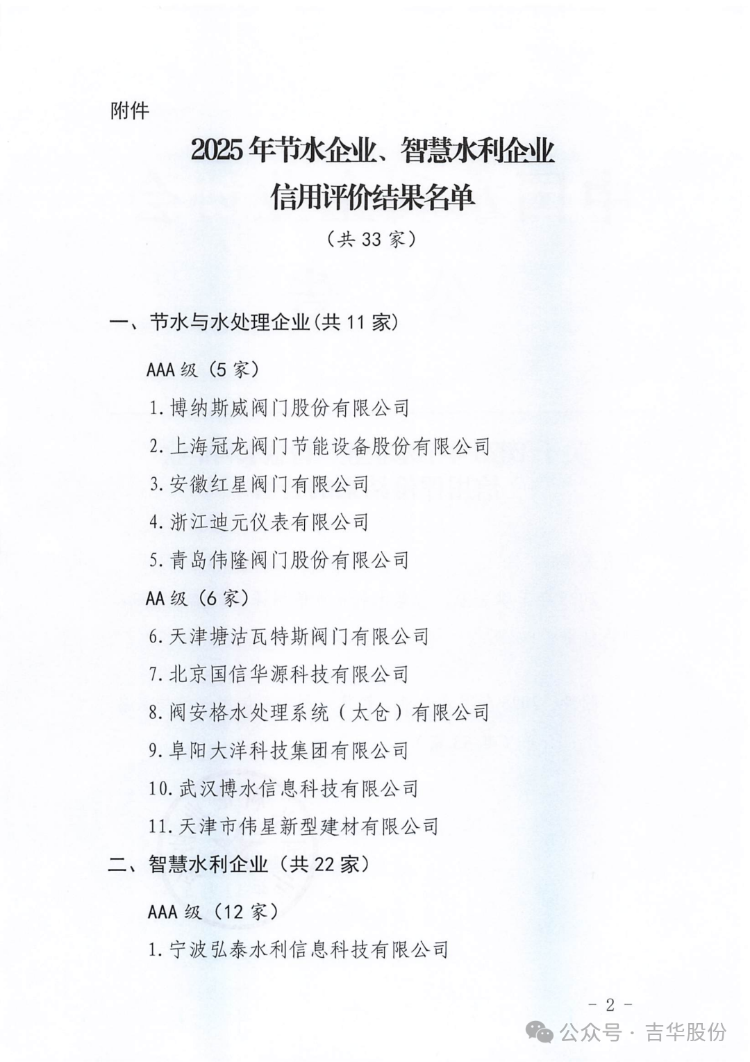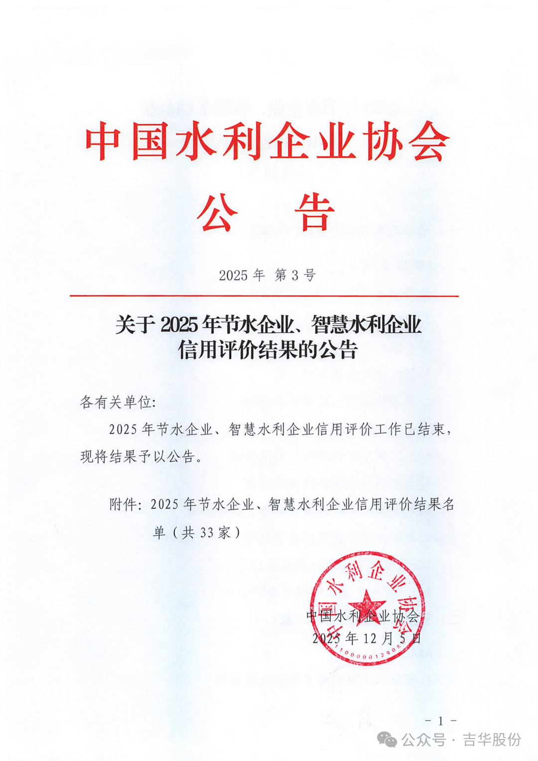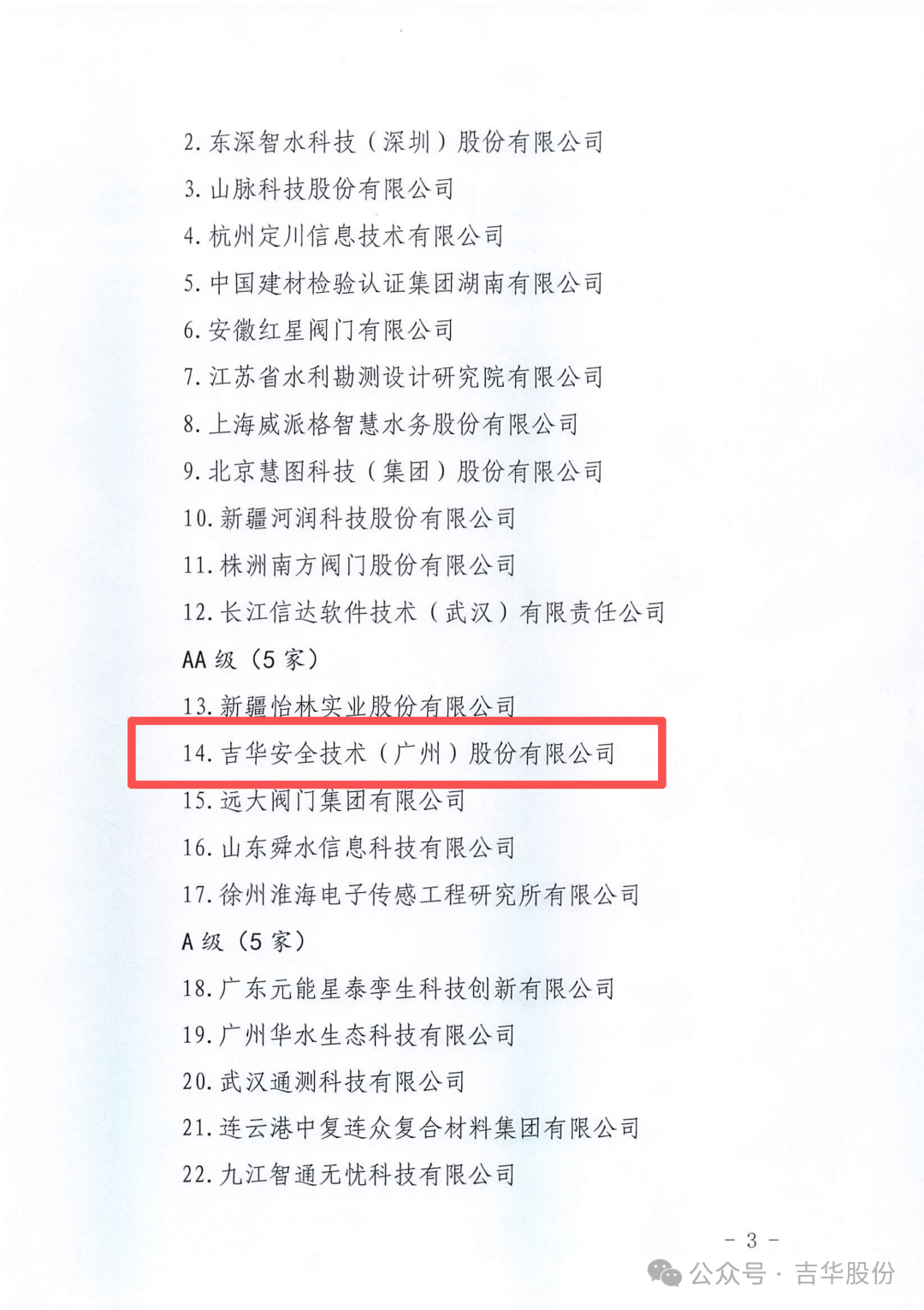 12月5日,中国水利企业协会发布《关于2025年节水企业、智慧水利企业信用评价结果的公告》。本次共有22家企业获评智慧水利企业信用评价A、AA、AAA等级,其中,吉华安全技术(广州)股份有限公司被评定为智慧水利企业AA级单位。