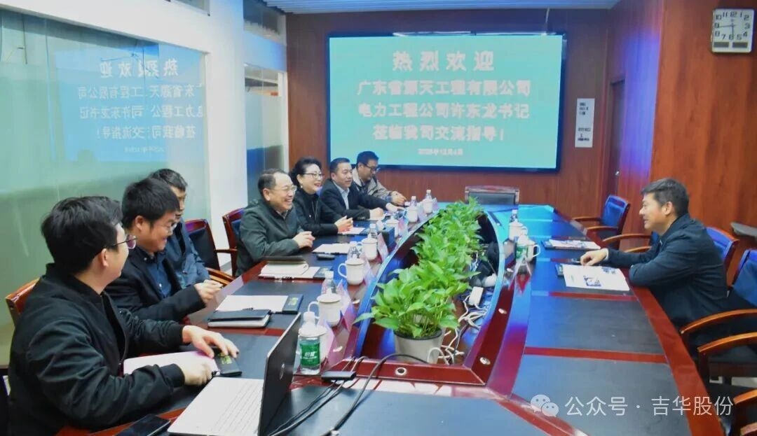 12月4日下午,广东省源天工程有限公司电力工程分公司党支部书记、总经理许东龙到吉华股份考察交流。吉华股份董事长兼总经理彭炎华、董事杜河清、副总汤玲、营销总监王升强、营销副总王中华、技术负责人白云和、智慧能源部经理黄利军参与座谈。双方围绕电力基础设施安全智能化系统综合解决方案的技术创新、行业应用及未来合作方向进行交流。
