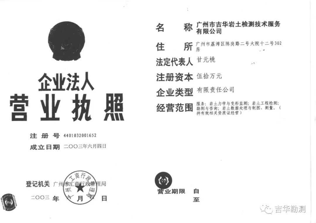 16年前的今天,即2003年6月4日,广州市吉华岩土检测技术服务有限公司注册成立,成为行业内首个以大学科研机构的重点科研领域“岩土力学与变形监测”作为经营范围的企业,开始了对工程防灾与健康监测的应用研究。2009年公司更名为广州市吉华岩土检测有限公司,并正式组建团队,开始经营。2014年公司进行股份制改造,更名为广州市吉华勘测股份有限公司,登陆资本市场(股票代码831708,简称“吉华勘测”)。