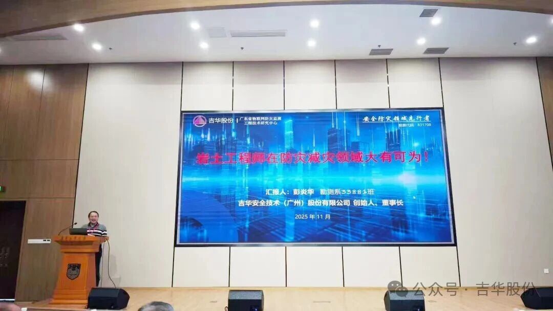 彭炎华在报告中指出,岩土工程正迎来与物联网、大数据、人工智能等新技术深度融合的重要机遇。他结合国家防灾减灾战略需求,介绍了吉华安全技术在灾害监测预警与风险防控方面的创新实践,强调要推动灾害防控从被动应对向主动防治转变,实现安全防灾工作的智能化发展。