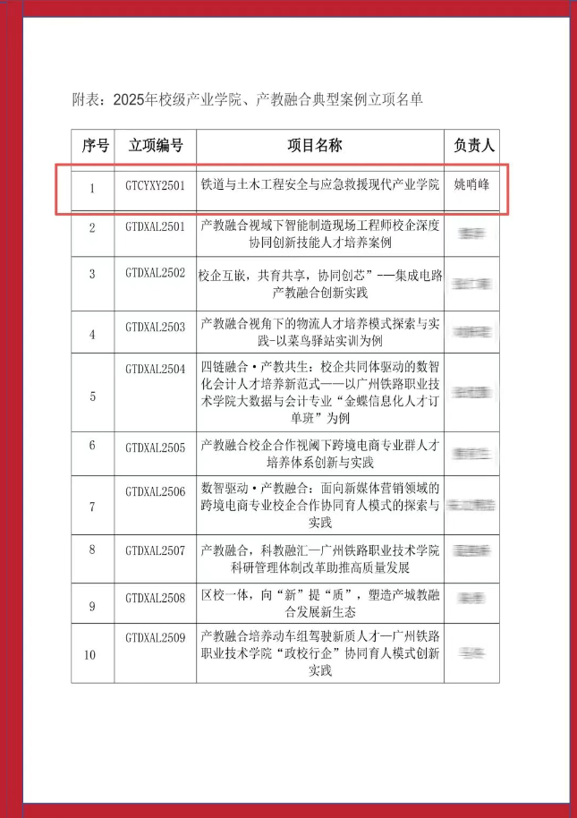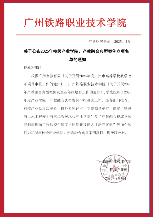 近日,广州铁路职业技术学院公布2025年校级产业学院与产教融合典型案例立项名单。吉华安全技术与广铁职院姚哨峰博士团队联合申报的“铁道与土木工程安全与应急救援现代产业学院”项目成功入选。